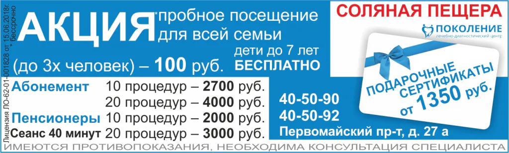 Преобретая абонемент на 10 сеансов, вы получаете 5 сеансов в подарок! Укрепляем иммунитет перед зимой с «Доктор Соль!» Акция действует при покупке абонементов до 5 ноября. Контакты: 52- 58-68, Народный бульвар, 15 (позади дома)