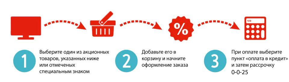 Товары, которые проходят по акции "0-0-25" в "ЭЛЕКС" можно приобрести в рассрочку без первого взноса и переплат.