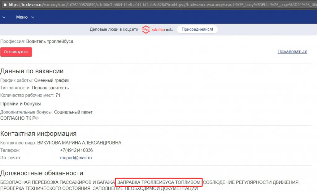 Необычная вакансия привлекла внимание подписчиков группы ВКонтакте Подслушано у Водителей Рязани #ПУВР. МУП Управление Рязанским Троллейбусом начало искать 71 нового водителя. Самая интересная часть объявления - должностные обязанности, где указано, что кроме вполне тривиальных требований в духе "безопасной перевозки пассажиров" и "соблюдения регулярности движения", водитель будет обязан "заправлять троллейбус топливом".