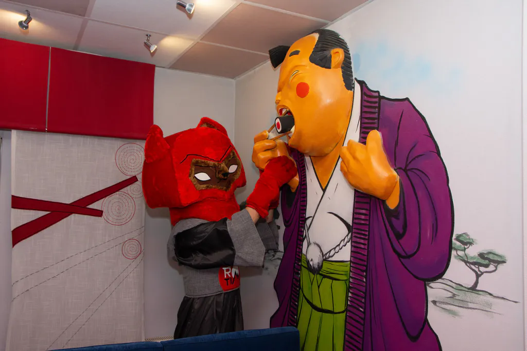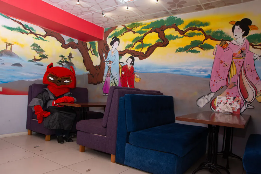 Мы сделали заказ и решили осмотреться, экскурсию в мир Японии взялся вести кот-талисман. На стенах мы увидели оригинальные панорамы ручной работы, переносящие гостей в культуру Японии. Интересная задумка со скульптурными экспозициями, которые делают настенные арты объемными. Некоторые граффити выполнены с художественной изящности, некоторые с определенной долей юмора. Ни в одном рязанском заведении ничего подобного мы не видели. На полу можно заметить сколы плитки, косметический ремонт не будет лишним.
