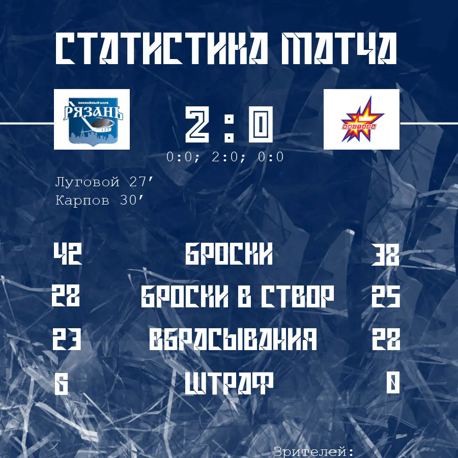 ХК «Рязань» у себя дома переиграл «Ижсталь» из Ижевска со счётом 2:0. Об этом сообщила пресс-служба клуба на своей странице ВКонтакте.