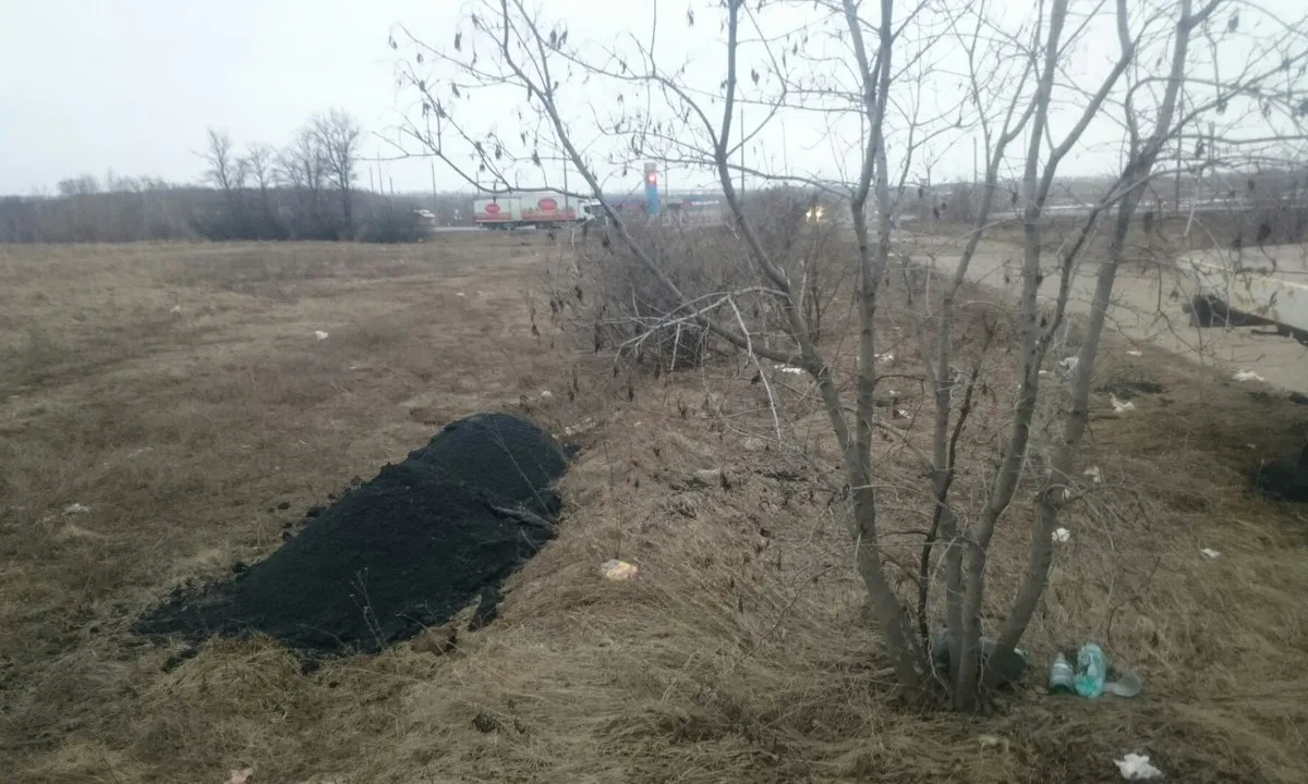Очевидец сделал фотографию, на которой отчетливо видна огромная куча неиспользованного асфальта, сброшенная в кювет.