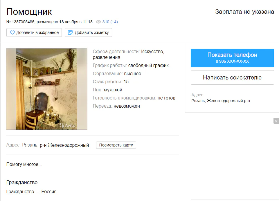 Самое загадочное объявление из всех нами найденных. "Помогу многое..." - таинственно утверждает человек, поставивший фотографию уголка с иконами. Чем он может помочь в сфере искусства и развлечений, не уточняется. Но многое.