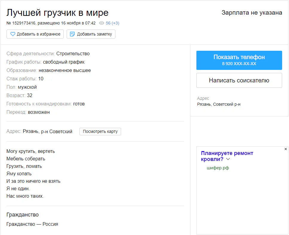У автора этого объявления невероятно поэтическая душа. Возможно, не ту профессию он выбрал в жизни. Но утешает, что в Рязани поэт-грузчик не один, их много таких. Вот что родина Есенина с людьми делает.