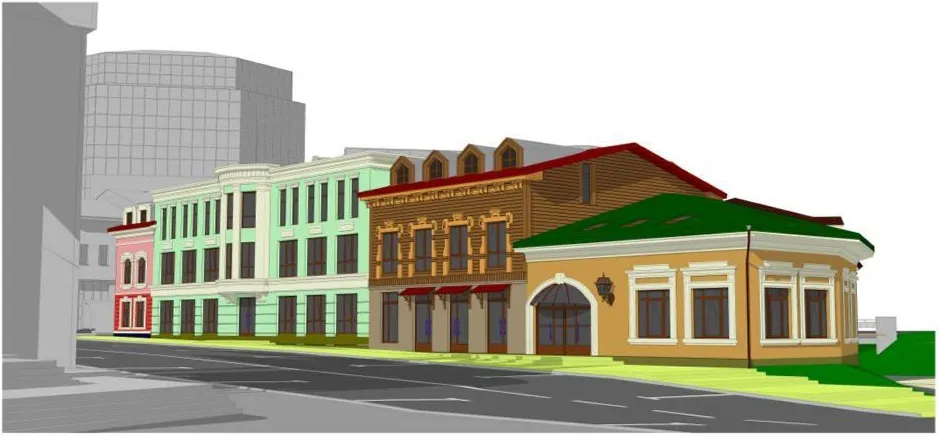 В зданиях расположатся: торговая площадь, кафе на 60 человек с мансардой, офисные помещения, подземный паркинг на 70 машино-мест и прокат для семейного отдыха.Сейчас на участке находится двухэтажный жилой дом дореволюционной постройки, который намерены снести.