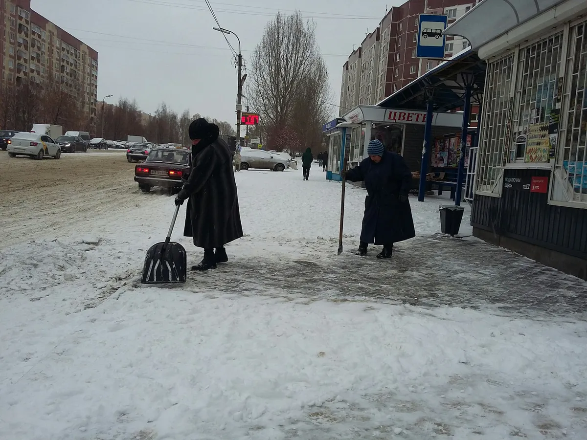 В Рязань пришла настоящая снежная зима, дороги и улицы замело снегом. Несмотря на повышенную готовность коммунальных служб, техники для уборки наледи, видимо, не хватает. На остановке «4-й квартал» в Дашково-Песочне остановку от наледи и снега убирают две песнионерки.