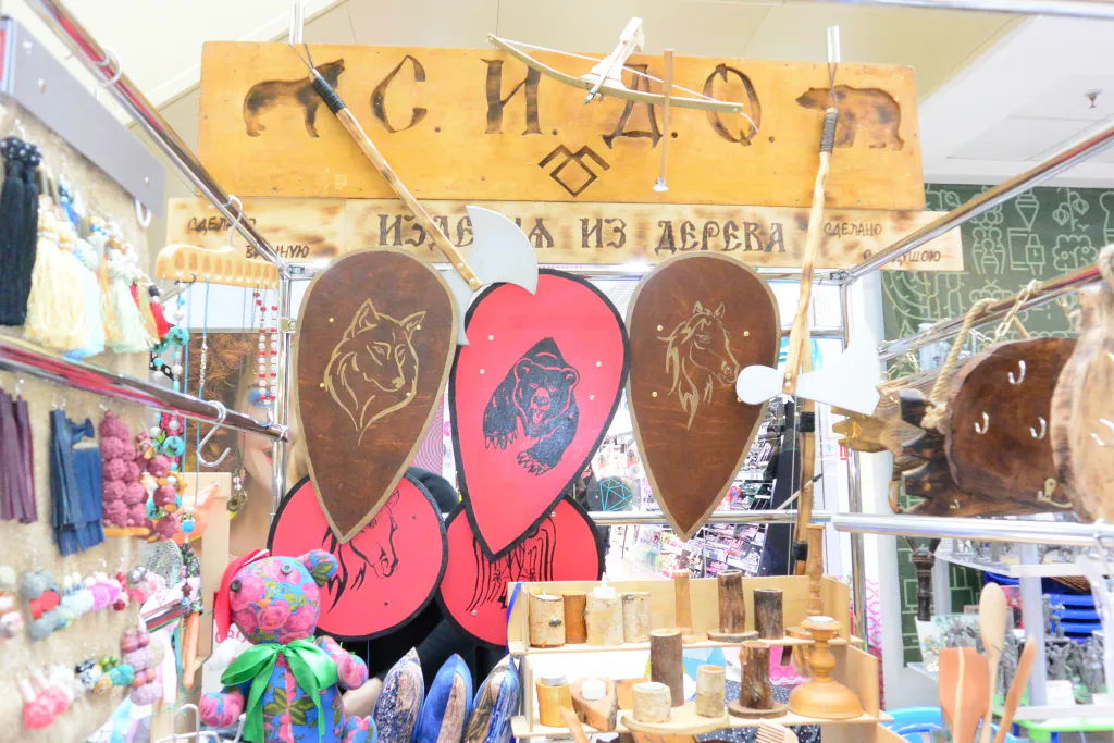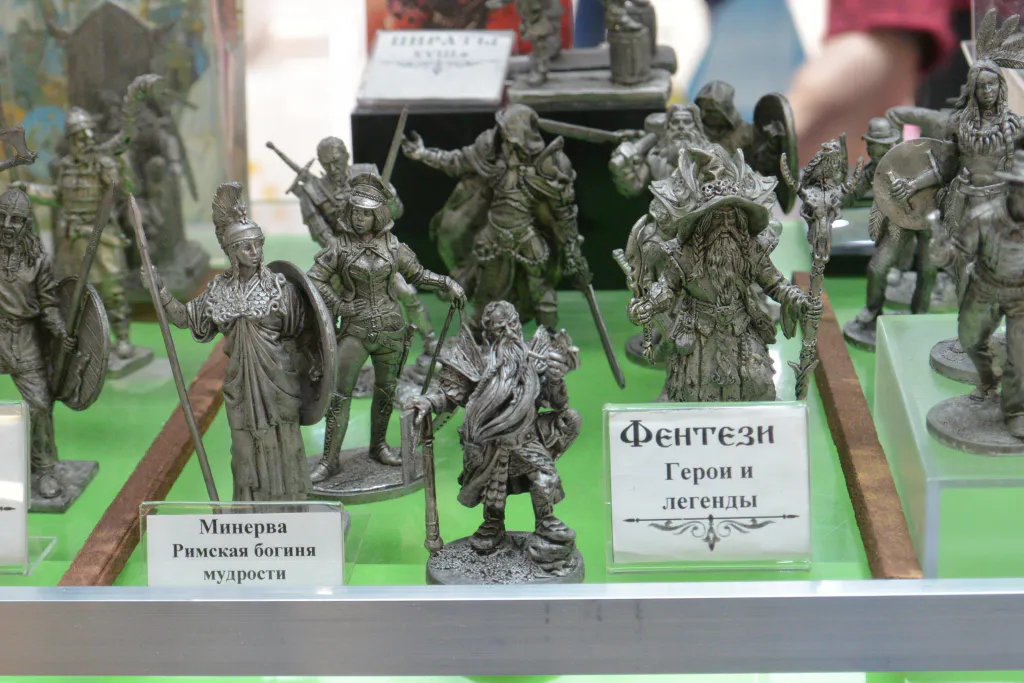 На прилавках лежат и украшения, и невероятно крошечные кованые изделия - от крохотных лочечек до миниатюрных ящериц. А у стенда с деревянным оружием и оловяными солдатиками постоянно собираются зрители. Есть простые фигурки, а есть изображения великих людей и героев фэнтези.