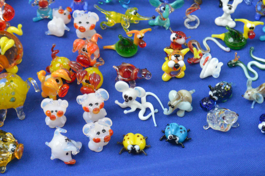 На ярмарке - самые разные вещи. И значки, и оловяные солдатики, и игрушки, и скатерти, и подушки, и даже мечи. Нашлись и стеклянные игрушки: