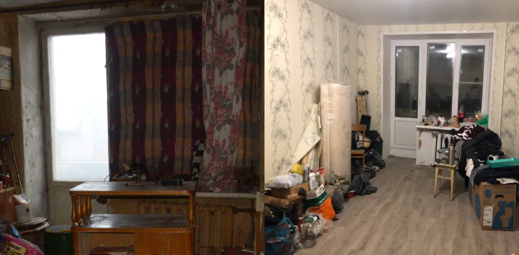 За те дни, пока бабушка лечится в больнице, работники от городской администрации отремонтировали спальню: выровняли стены и потолок, поклеили обои, установили окна в кухне и в комнате, сделали проводку, повесили люстру и уложили напольное покрытие. Параллельно неравнодушные рязанцы выносили из квартиры хлам и работали в ванной и коридоре. После ремонта планируется установить новую мебель - например, уже собрали диван: