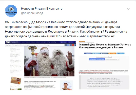 Дед Мороз из Великого Устюга 20 декабря открыл рязанскую новогоднюю деревню... и в этот же день встретился на границе с Финляндией со своим коллегой Йоулупукки. Такое забавное совпадение подметили рязанцы в соцсетях: