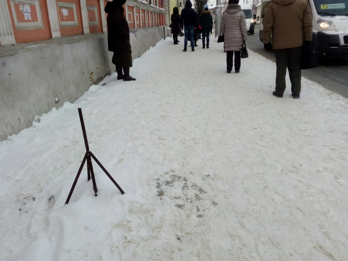 "Улица Ленина, остановка "Б-ка имени Горького. Нечищенный тротуар, час пик, на остановке - люди. Под ногами - снежная "каша", а под ней - лед. Вот на таком льду я и подскользнулась. Сумка - в одну сторону, я - в другую полетела. Поднимаюсь, оглядываюсь и понимаю, что упала я - более чем удачно ( если это выражение вообще уместно ): рядом со скользким участком торчит вмерзшая в лед металлическая конструкция с острым штырем вверх. И, сместись , я в "полете" хоть чуть в сторону, прям бы в меня и вошел этот "штырь"! А это же центр города. Там вообще не видно этот штырь посреди тротуара и очень скользко!!!! Как он вообще там оказался?"