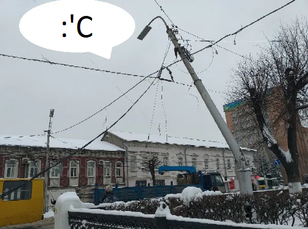 Накренившийся столб спровоцировал аварию 25 декабря - он "прилег" на провода и застопорил движение троллейбуса. Об этом нам сообщили очевидцы. По их словам, у столба прогнило основание, и из-за этого он и приуныл.