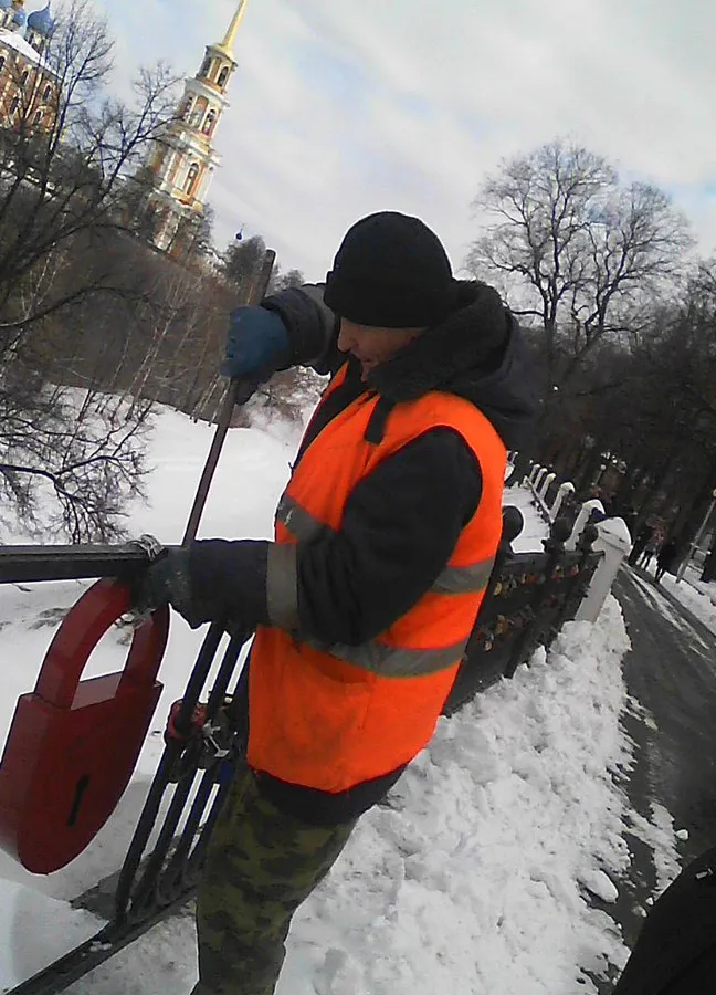 «Этих замков вообще здесь не должно быть. Вешать их запрещено.» - говорит один из рабочих, срывая в этот момент цепь, на которой висел нашумевший огромный замок.