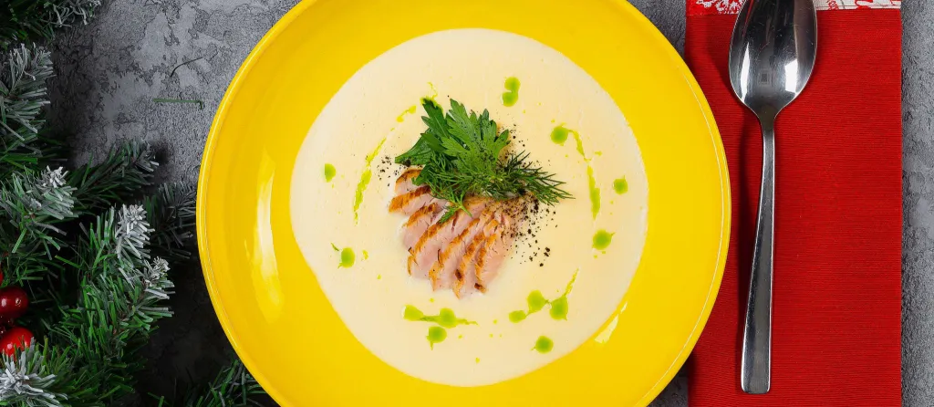 На мгновенье отойдем от концепции ужина. Вдруг вы окажитесь в "Бон Аппетит" на обеде. Тогда вам обязательно стоит попробовать сырный суп с индейкой и хрустящими гренками. 280 рублей за сытный обед.