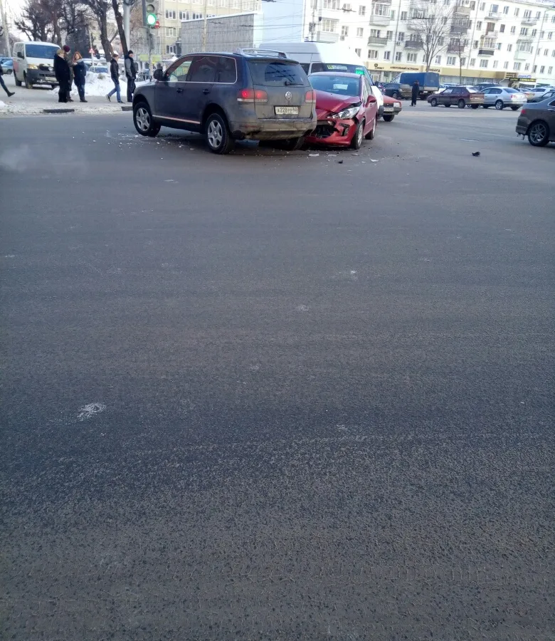 Сегодня днём на перекрёстке на площади Театральной столкнулись две иномарки - VW Toureg и Peugeot 408, - фотография с места аварии появилась в группе «Подслушано у Водителей Рязани». Очевидцы утверждают из-за аварии на Театральной площади образовывается пробка. Официальной информации о ДТП пока нет.