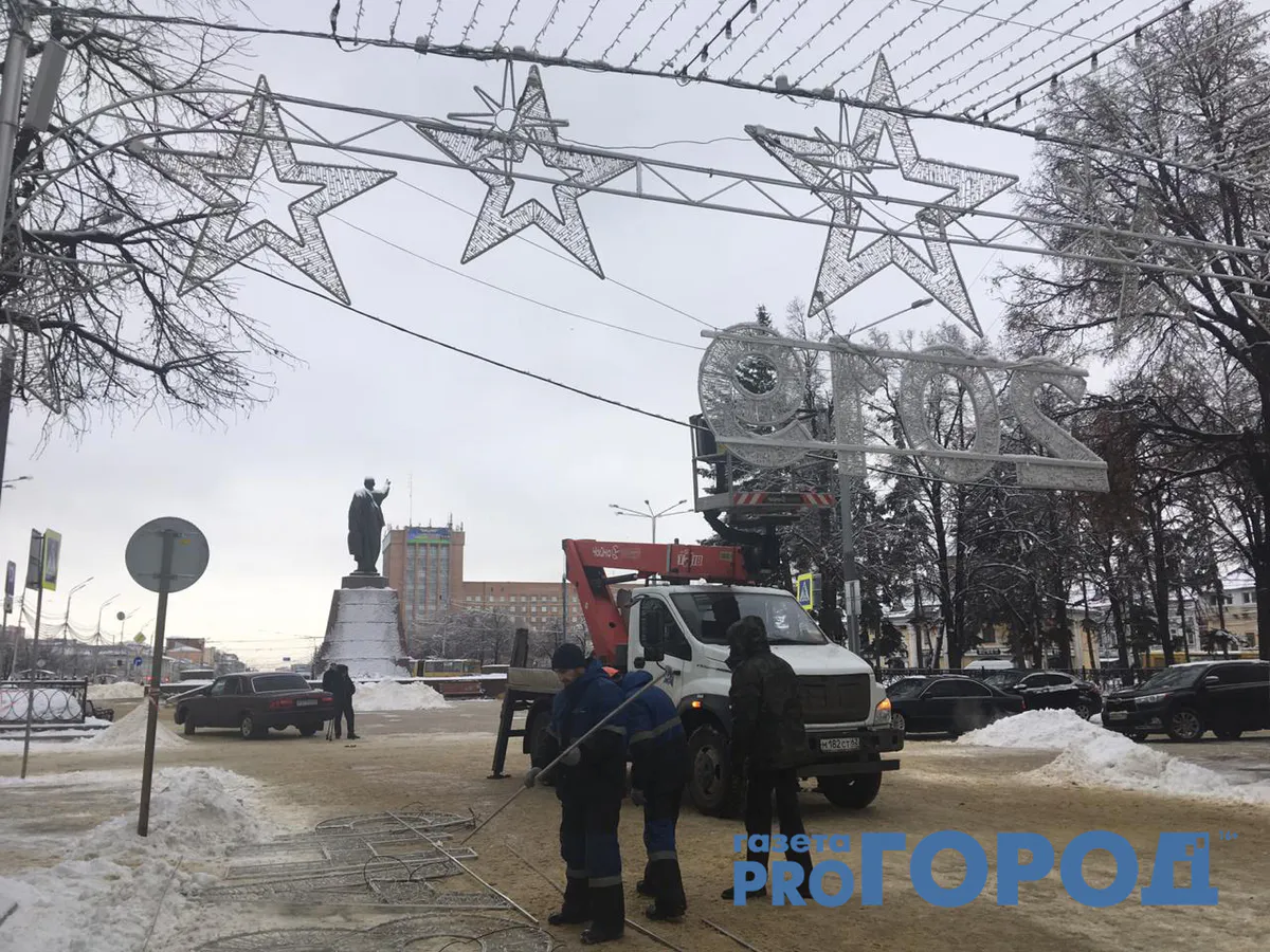 Сегодня днём коммунальные службы восстановили упавшую накануне гирлянду «Рязань». Гирлянда упала из-за непродуманной очистки крыш от снега и наледи. Рабочий очень старался очистить заснеженную крышу, но ненароком заодно очистил Почтовую от гирлянды. Сбитая им глыба упала прямиком на светящуюся вывеску "Рязань" из-за неаккуратной очистки крыши дома от снега и наледи.