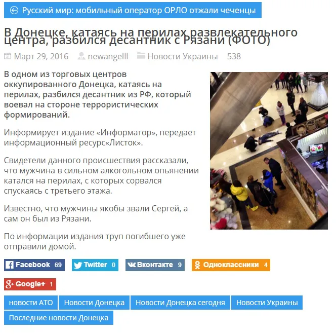 Эта новость появилась на сайте новостного интернет-издания «News UA» 29 марта, под заголовком: «В Донецке, катаясь на перилах развлекательного центра, разбился десантник с Рязани».