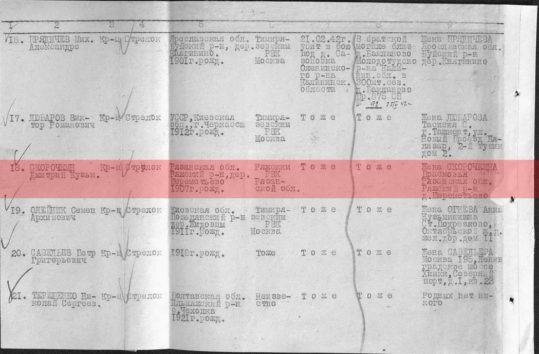 - В ходе поисковых работ в окрестностях села Холмец, Оленинского района, при проведении эксгумационных работ санитарного захоронения времен ВОВ Тверским поисковым отрядом "Поколение" обнаружен солдатский медальон с самодельной запиской внутри: Скорочкин Димитрий Кузьмич. Город Ряжск Рязанской области, село Шереметьево. На истлевшем фрагменте бумаги - Прасковья, - сообщают участники отряда. - Сейчас мы ищем родных бойца для передачи находки. Обращаться можно по телефону 8 - 903 - 806 - 50 - 87