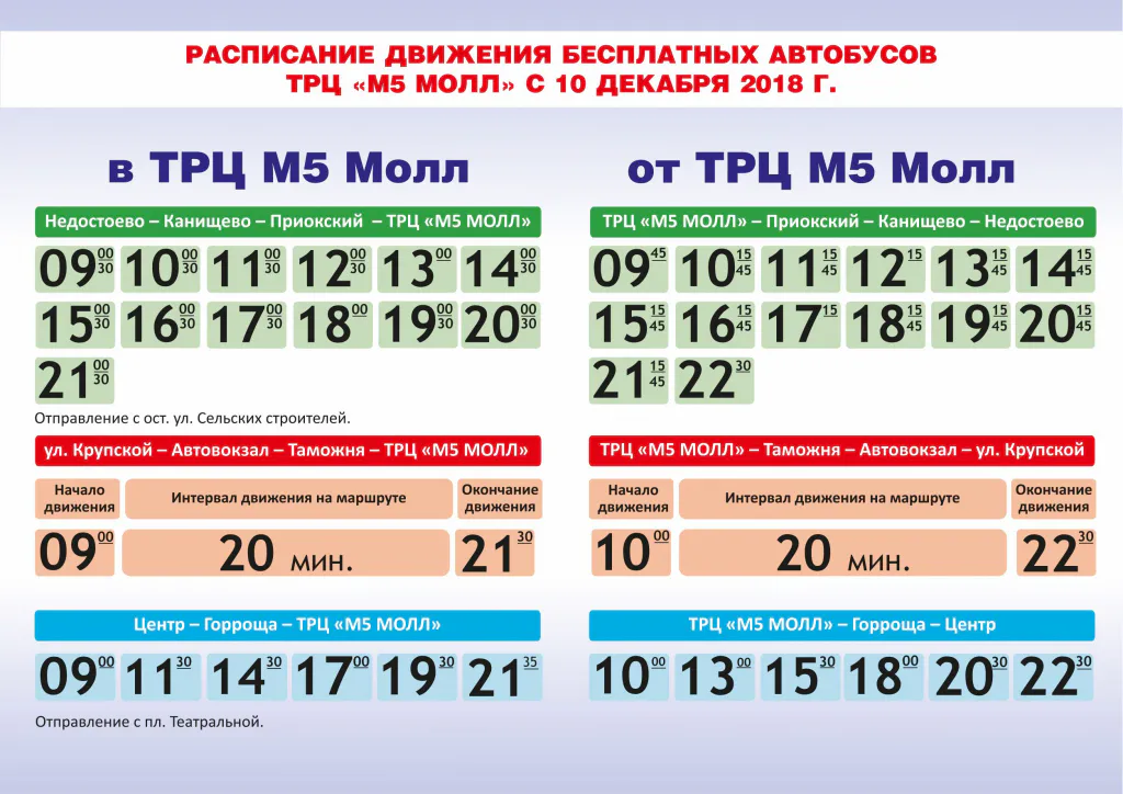Многие рязанцы жаловались на то, что на многих информационных площадках размешено неправильное расписание бесплатных автобусов до ТРЦ М5 Молл. В связи с этим пресс-служба ТРЦ публикует актуальное расписание движения.