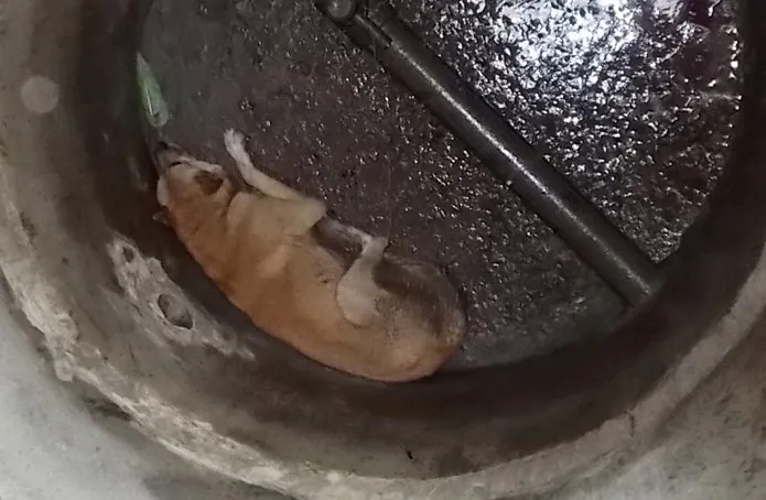 В этом колодце были ступеньки, приваренные к стене, по ним Яна начала спускаться вниз. Она обвязала собаку и мы с молодым человеком подняли ее наверх. Животное было обессиленным, не сопротивлялось и не проявляло интереса к происходящему.