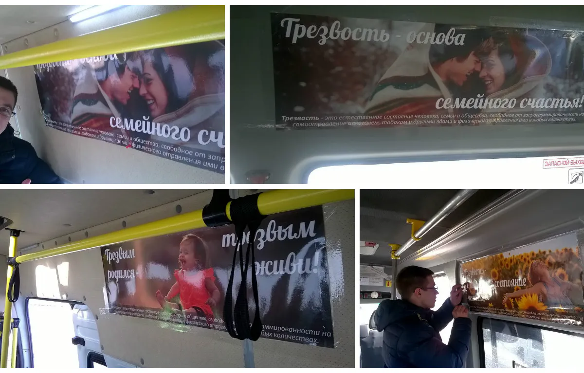Активисты Союза борьбы за народную трезвость расклеивают в рязанских маршрутках плакаты, пропагандирующие здоровый образ жизни.