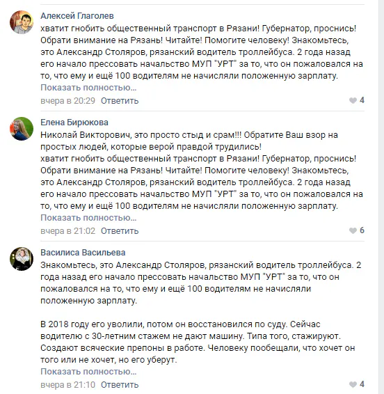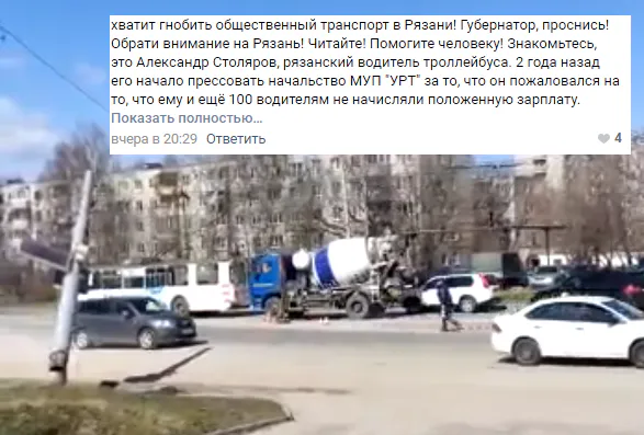 - Знакомьтесь, это Александр Столяров, рязанский водитель троллейбуса. 2 года назад его начало прессовать начальство МУП "УРТ" за то, что он пожаловался на то, что ему и ещё 100 водителям не начисляли положенную зарплату, - пишет автор поста.