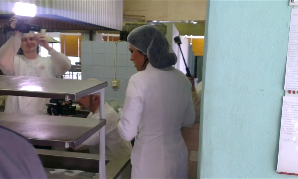 Новая ведущая Ольга Романовская проводит проверку в столовой завода "Красное знамя". Девушка одета в белый халат и в головном уборе. На видео видно, что она проверяет еду и уже сделала замечание по поводу условий  ее хранения.