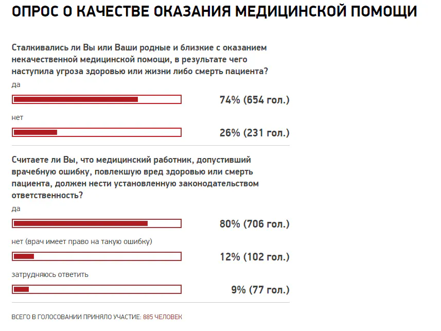 Согласно результатам, опубликованным на сайте Следственного управления, 654 рязанца (74%) встречались с оказанием некачественной медицинской помощи, в результате чего наступила угроза здоровью или жизни, либо смерть пациента. 231 рязанец (26%) с таким не сталкивались. 80% опрошенных рязанцев - 706 человек - считают, что медицинский работник, допустивший врачебную ошибку, повлекшую вред здоровью или смерть пациента, должен нести установленную законодательством ответственность. 12% опрошенных (102 человека) думают, что врач имеет право на ошибку.