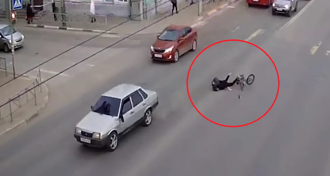 В центре Рязани автомобиль сбил велосипедиста, пересекавшего дорогу. Видео инцидента опубликовано в группе "Дороги Рязани".
