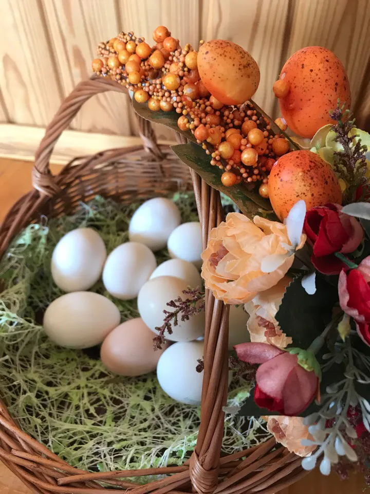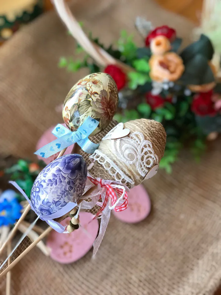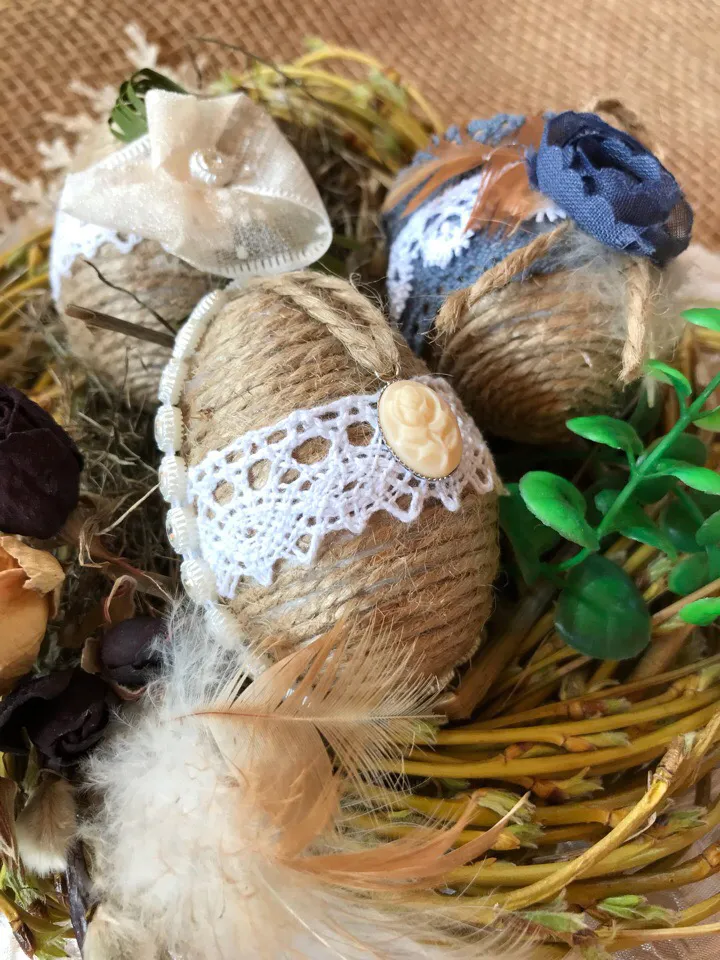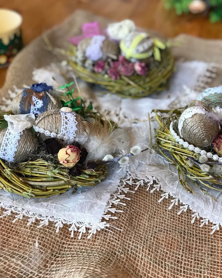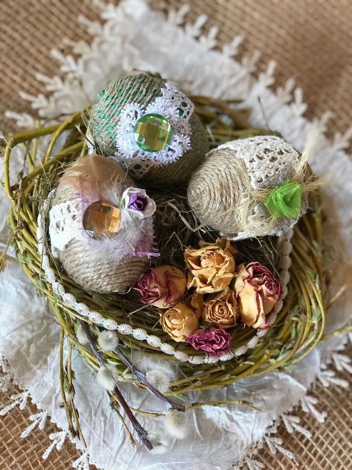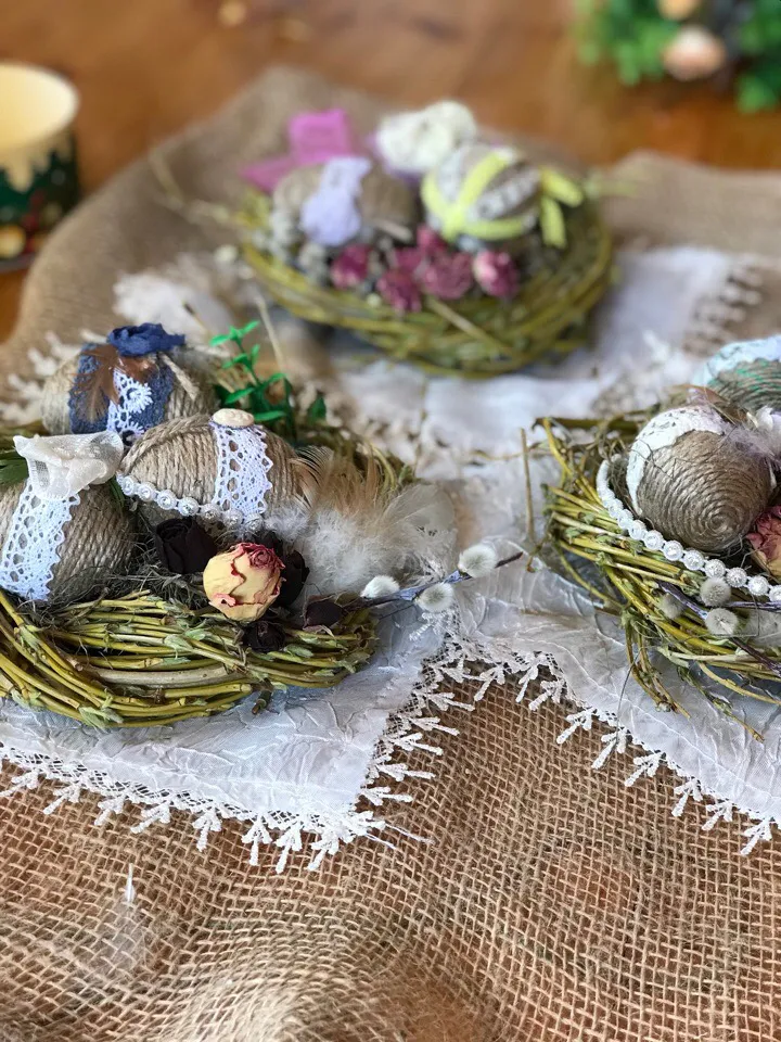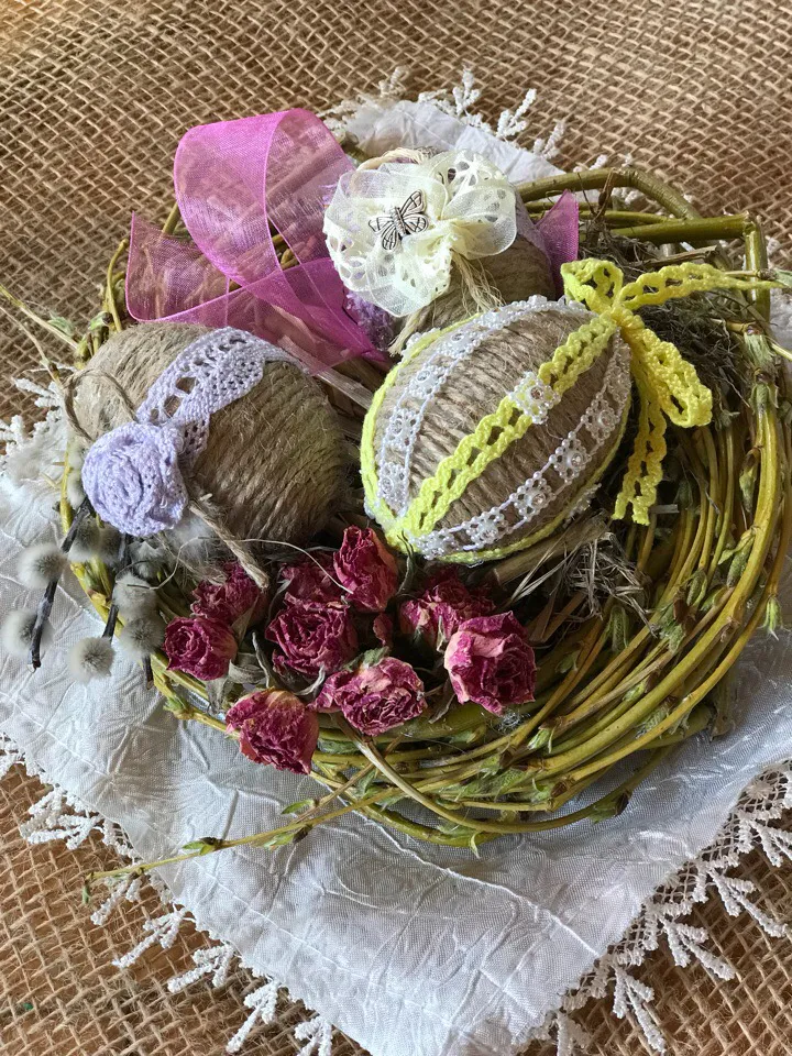 Беру еловые веточки и сено, покупаю декоративные пасхальные яйца из пенопласта, ленточки, бусинки и бисер, искусственные цветы-и начинаю творить. Пасхальные венки, украшенные бусами и цветами, гнёздышки из сена для праздничных яиц, корзинки с сухоцветами и ягодами- все эти декорации каждый год украшают наш дом. Я всегда делаю что-то новое, придумываю разные "изыски".