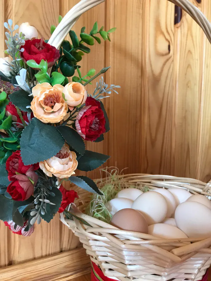 Дома в этот день украшали венками из зеленых веточек и живых цветов. На окна развешивали рушнички с вышивкой крестом. Зажигали лампады и свечи. Собрать цветы для праздника или смастерить их из подручных средств было очень увлекательным занятием. Дети и взрослые вырезали цветы из яркой цветной бумаги, ими же украшали стол, иконы, дом. Ещё одним пасхальным украшением были корзины. Плетёные корзинки выглядели очень нарядно. Одни укладывали в них куличи, другие- пасхальные яйца. Многих клали крашеные яйца на тарелку: сверху её покрывали соломой или зелёными листьями-получалось маленькое гнездо.