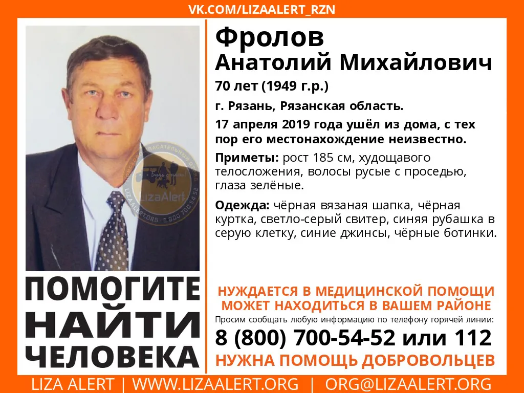 В Рязани пропал 70-летний пенсионер - Анатолий Фролов, - сообщение об этом появилось в группе ПСО Liza Alert. По данным волонтеров, мужчина может нуждаться в медицинской помощи.