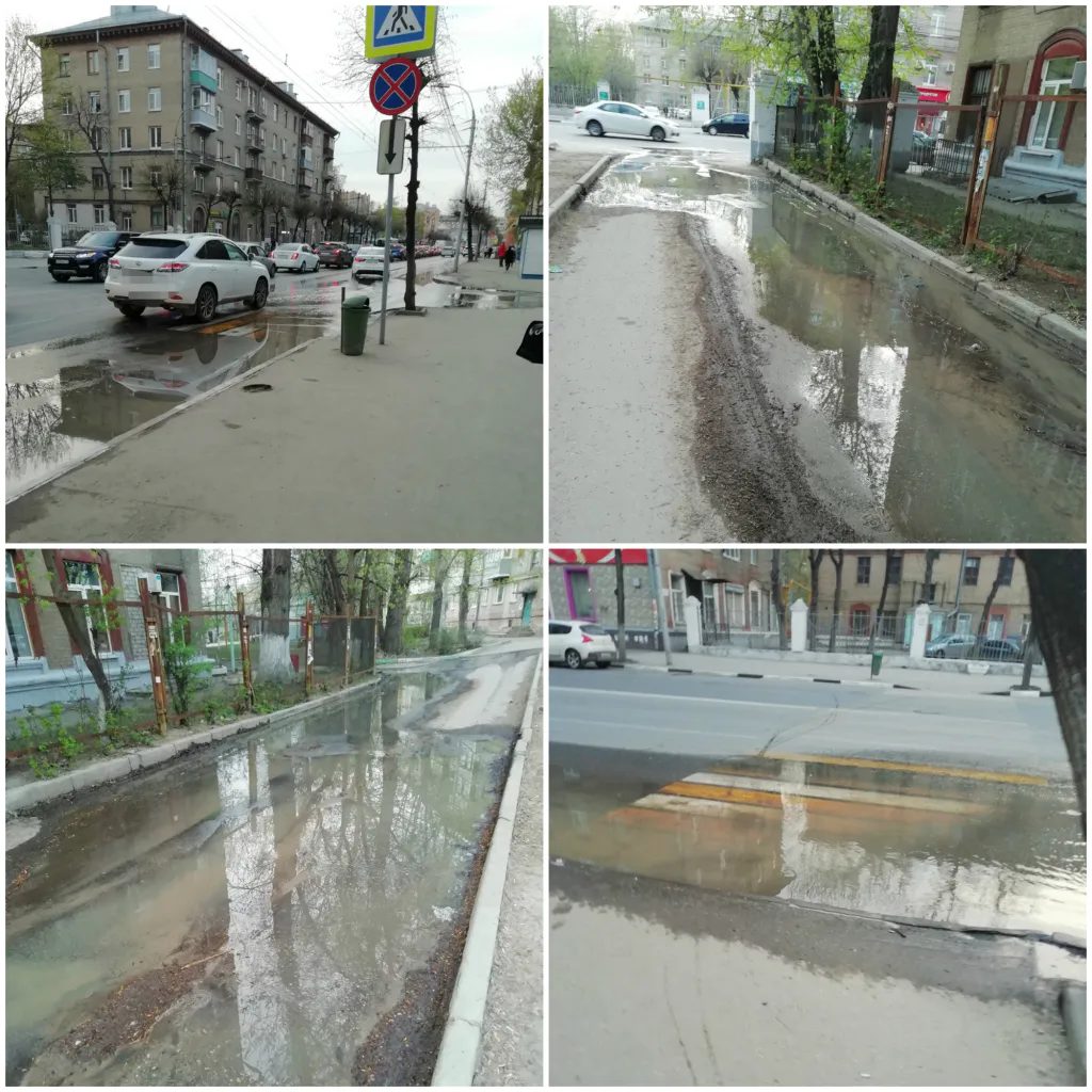 "Дорогу перейти невозможно, вдоль тротуара вода, при чём её уровень немаленький- можно по щиколотку "утонуть". Время, когда тает снег, давно закончилось" - пишет девушка, которая уверена, что по улице течёт талая вода от "хранилища снега" на территории УРТ: