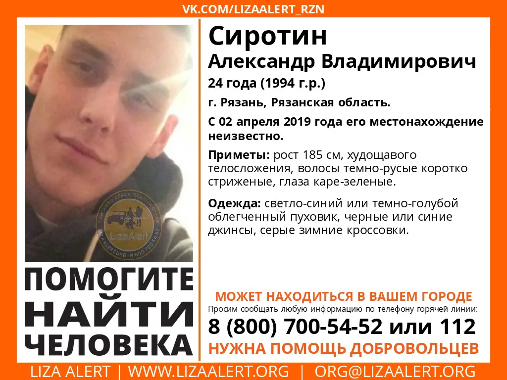В Рязани разыскивают 24-летнего Александра Сиротина. Об этом сообщают волонтеры поисково-спасательного отряда "Liza Alert".
