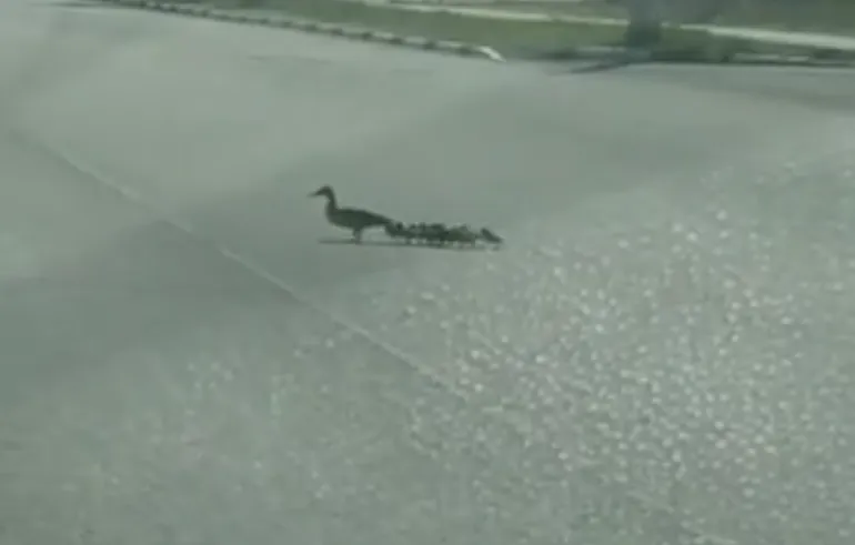 Днем 5 мая автомобилистам, которые ехали по Московскому шоссе пришлось пропустить необычных пешеходов. Дорогу решила перейти утка с целой вереницей маленьких утят.