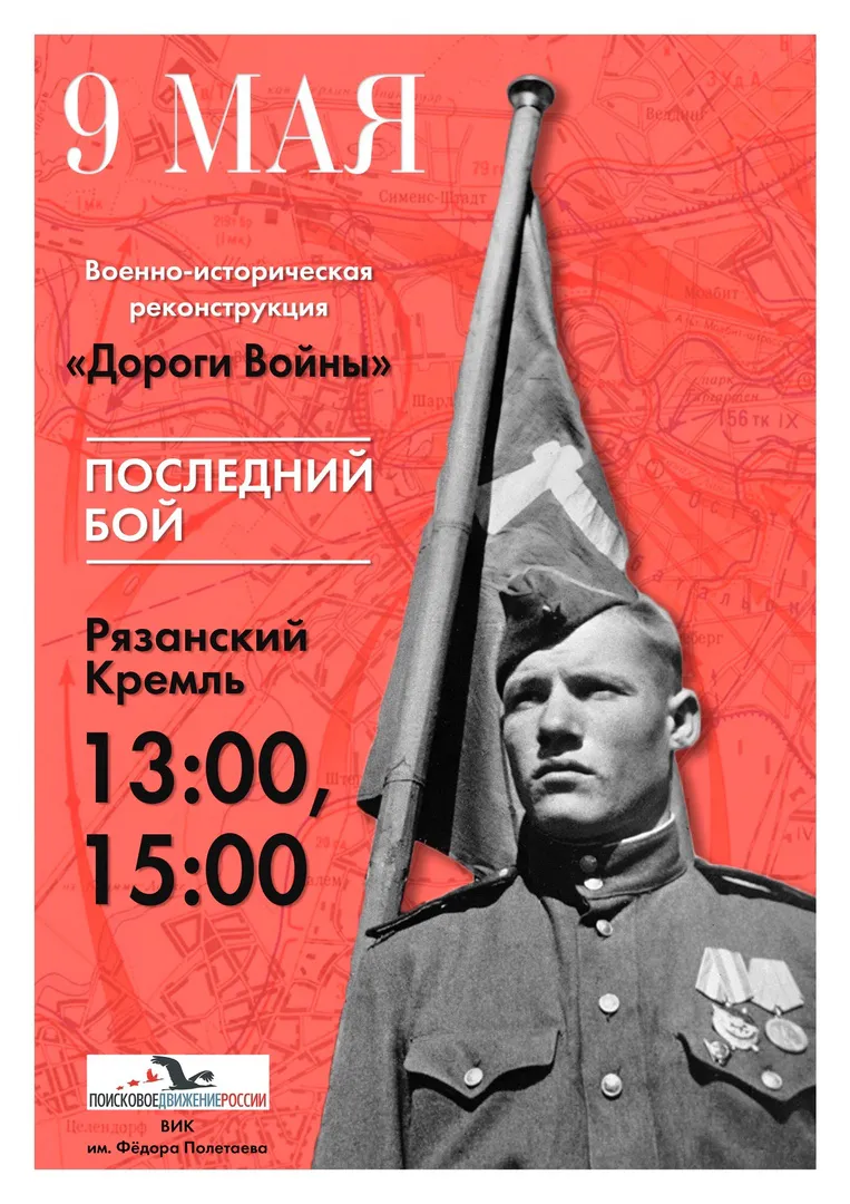 В День Победы в Рязани покажут военно-историческую реконструкцию "Дороги войны" -"Последний бой". Увидеть эпизод сражения конца весны 1945 года смогут все желающие. Также зрителям покажут историческую технику и оружие времён Великой Отечественной. Реконструкция пройдёт 9 мая в 13:00 и 15:00 на территории Рязанского Кремлёвского вала и 10 мая на территории Рязанского лесопарка.