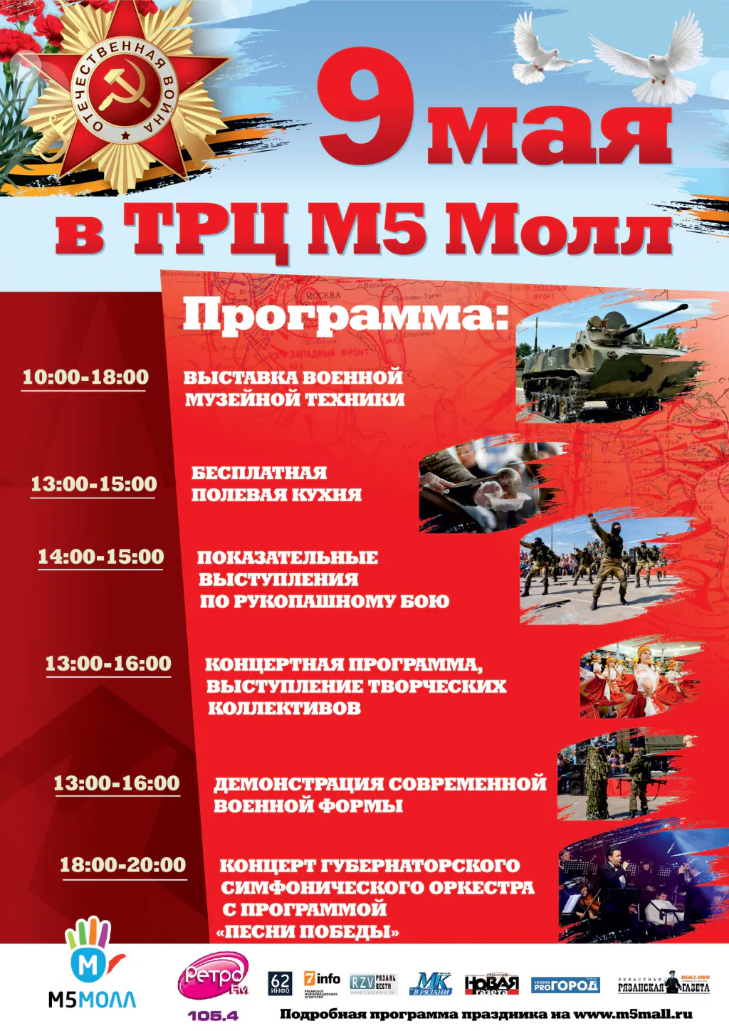 Праздничная программа мероприятий в ТРЦ М5 «Молл», приуроченная ко Дню Победы начнётся в 10:00 с открытия выставки современной военной техники на парковке около ТРЦ «М5Молл». Работа экспозиции продлится до 18:00. Гости смогут узнать о технических характеристиках боевых машин, стоящих на вооружении армии России, а также сделать памятные фотографии.