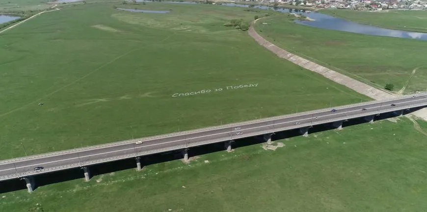 Перед Днём Победы у Окского моста появилась гигантская надпись - «Спасибо за Победу». Об этом сообщает ГТРК «Ока».