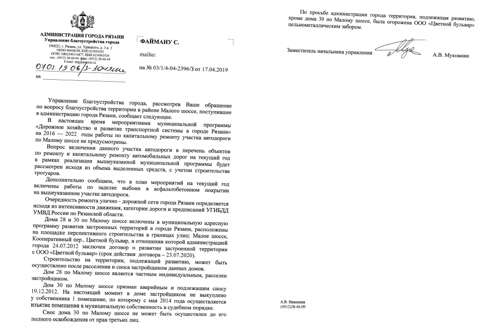 В администрации города на наш запрос, нам сообщили что работы по благоустройству территории не могут начать из-за того, что застройщик не может выкупить 1 помещение в аварийном доме на Малом шоссе, 30. С мая 2014 года, осуществляется изъятие помещения в муниципальную собственность в судебном порядке.