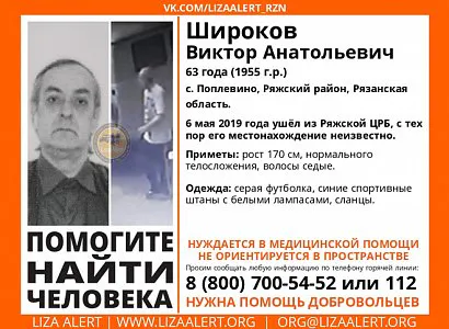 6 мая 2019 года пенсионер ушел из Ряжской больницы и с тех пор его местонахождение неизвестно. По информации волонтеров, мужчина нуждается в медицинской помощи и не ориентируется в пространстве.