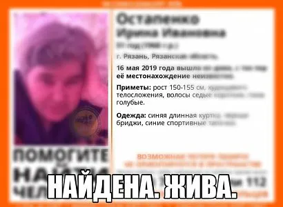 51-летняя рязанка Ирина Остапенко, которая пропала 16 мая, найдена живой. Об этом сообщил поисковый отряд Lisa Alert.