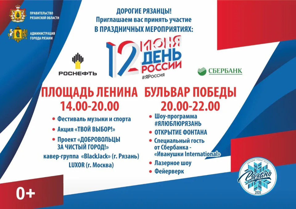 12 июня в Рязани будут с размахом праздновать «День России». Гуляния запланированы сразу на двух площадках города: на площади Ленина и на бульваре Победы. Праздник начнётся на площади Ленина в 14:00 с гимна России, который исполнит сводный тысячный хор. Также, гостей площадки ждут показательные выступления десантников, также состоится велосипедный фристайл», «Батутный фристайл», спортивные соревнования по разным видам спорта. Затем покажут презентацию программы праздников в рамках проекта "Рязань - новогодняя столица" с участием Деда Мороза и Снегурочки.