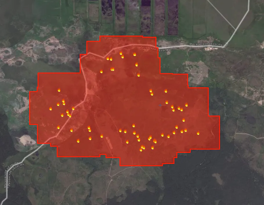 В Рязанской и Московской областях продолжается тушение пожара, но пока, судя по Карте пожаров, не очень успешно. Площадь пожара уже составляет 24,52 квадратных километра. Мы связались жителем Сельцов, который пожелал остаться анонимным, и он рассказал, как сейчас обстоят дела в местности: