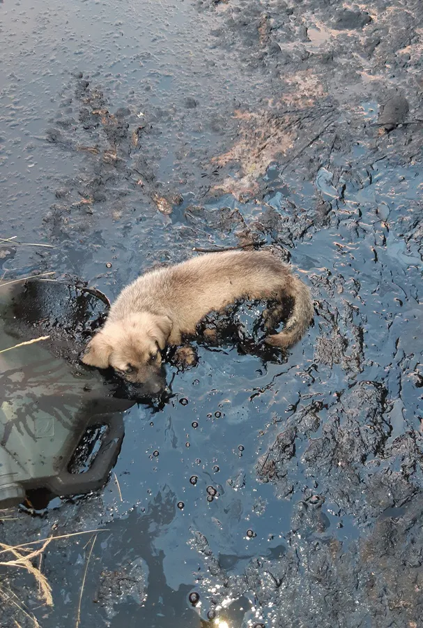 - У дороги в сторону деревни Земское обнаружены лужи битума, в которых тонули щенки и визжали от ужаса так громко, что слышно было с дороги. Щенков вытащили. Вызвали МЧС.