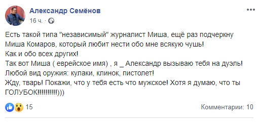 - Есть такой типа «независимый» журналист Миша, еще раз подчеркну Миша Комаров, который любит нести обо мне всякую чушь! Как и обо всех других! <...> Так вот, Миша, я вызываю тебя на дуэль!