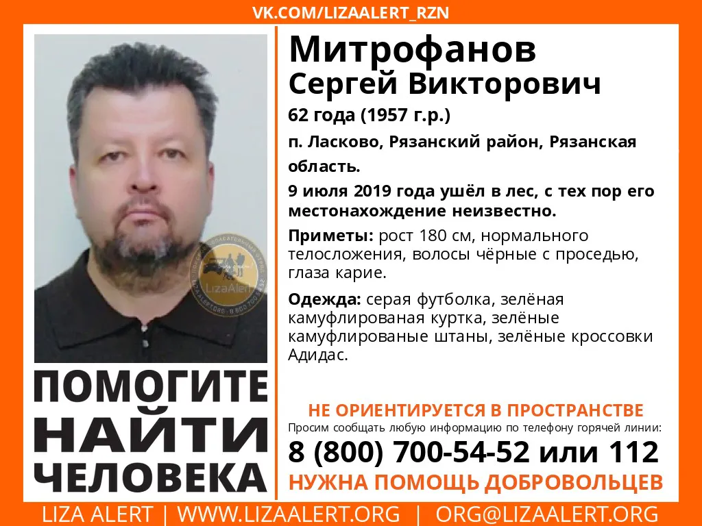В поселке Ласково Рязанского района пропал 62-летний Сергей Митрофанов. Об этом сообщает ПСО "Лиза Алерт Рязань".