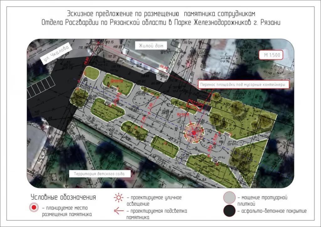 Росгвардия запланировала установить памятник росгвардейцам и сотрудникам правоохранительных органов, погибшим при исполнении служебного долга. Памятник представляет собой 11-метровую гранитную стела с четырьмя бронзовыми журавлями, которые символизируют светлую память о погибших, и тремя бронзовыми фигарами воинов. Один из воинов- рязанец, росгвардеец-спецназовец, Герой России Дмитрий Серков с девочкой на руках- символ надежно защищенного будущего поколения.