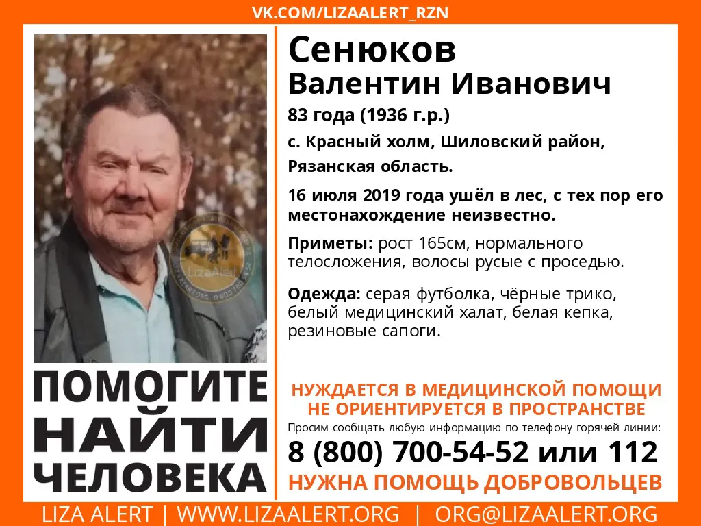 Волонтеры поисково-спасательного отряда "Лиза Алерт Рязань" просят помощи в поисках 83-лентнего жителя Шиловского района. 16 июля 83-летний Валентин Сенюков ушел в лес и не вернулся. Пенсионер из села Красный холм не ориентируется в пространстве и нуждается в медицинской помощи.