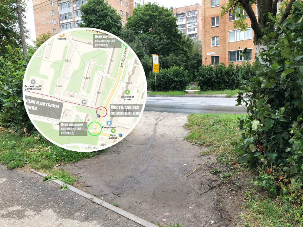В стороне образовался стихийный пешеходный переход, ведущий к улице Юбилейной, на которой расположены два детских сада и школа №55. По словам местных жителей, по утрам дети именно в месте, указанном на фото, пересекают дорогу по пути в школу. Мамы с колясками штурмуют улицу здесь же, и по словам женщин, им страшно переходить здесь улицу. Странного перехода чуть дальше по улице они тоже избегают, так как выезжать на него с коляской просто опасно. К тому же, на этом участке тихой улицы водители имеют привычку сильно разгоняться.