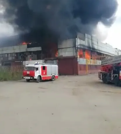 Возгорание произошло в производственном помещении одного из цехов. Площадь пожара составляет 500 квадратных метров. Пострадавших нет. На месте пожара работают 15 пожарных автомобилей, 43 человека личного состава Государственной противопожарной службы.